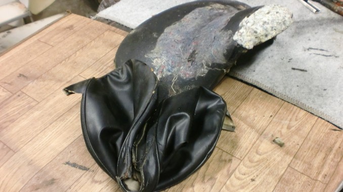 できることであれば純正オリジナルにて再生がおーなーさんのご希望です、シート表皮の硬化進行中ですので本日一部表皮うらに切り込みを入れ何とかシート皮外しました(無理をすると破れるというより割れそうな感じでした)