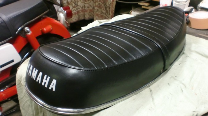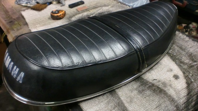 今回の作業はパンパンに張ったスポンジを整形してオリジナルに近いスッキリした形状に戻しました、表皮は破れ補強修理、ベースも若干ねじれ、ゆがみによる曲がりみうけられましたので修正済です、これによりテールYAMAHAロゴもきちんと収まりました!