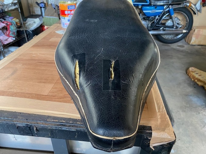 YAMAHA(ヤマハ)TX650初期型シート表皮破れ、硬化進行によるひび割れに液体ボンド塗布にて対応リメーク!